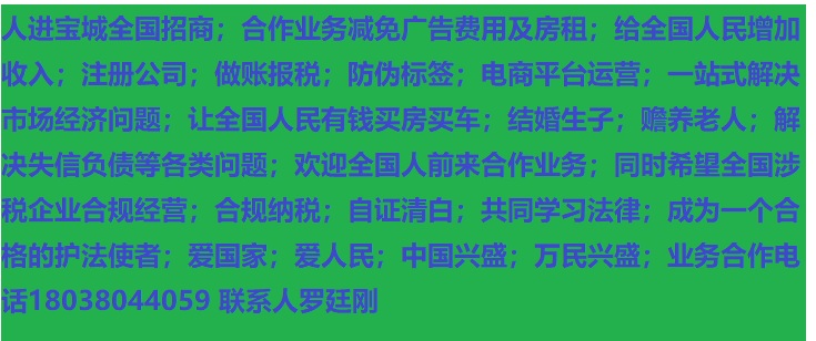 人進寶城全國招商;合作業(yè)務(wù)減免廣告費用;歡迎全國涉稅企業(yè)前來合作;業(yè)務(wù)合作電話 18038044059 聯(lián)系人羅廷剛